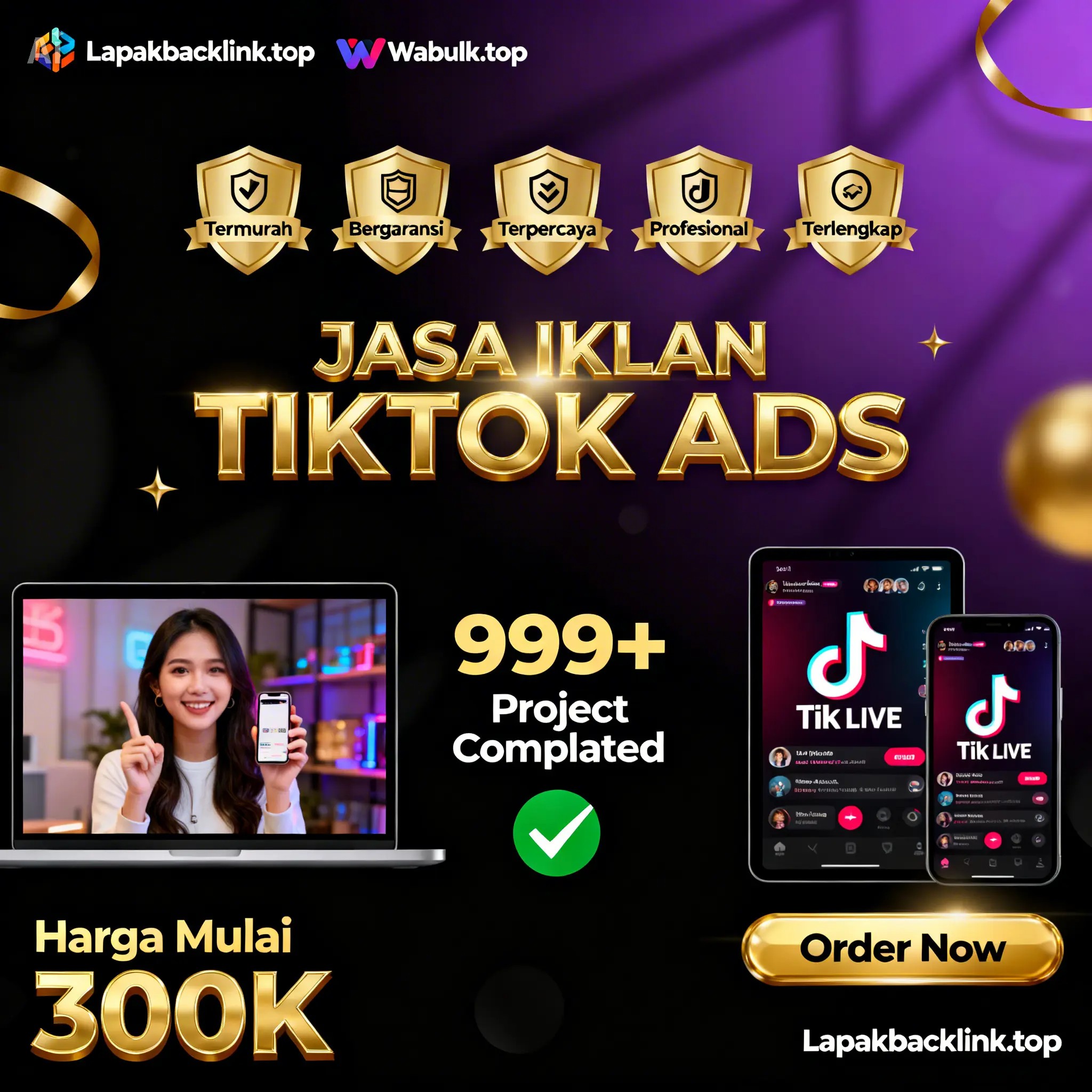 - Gratis Landing Page : Kami memberikan bonus layanan website landing page gratis untuk keperluan pengiklanan di Tiktok Ads khusus paket diatas 450 Ribu.